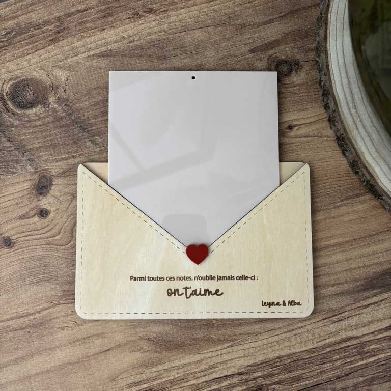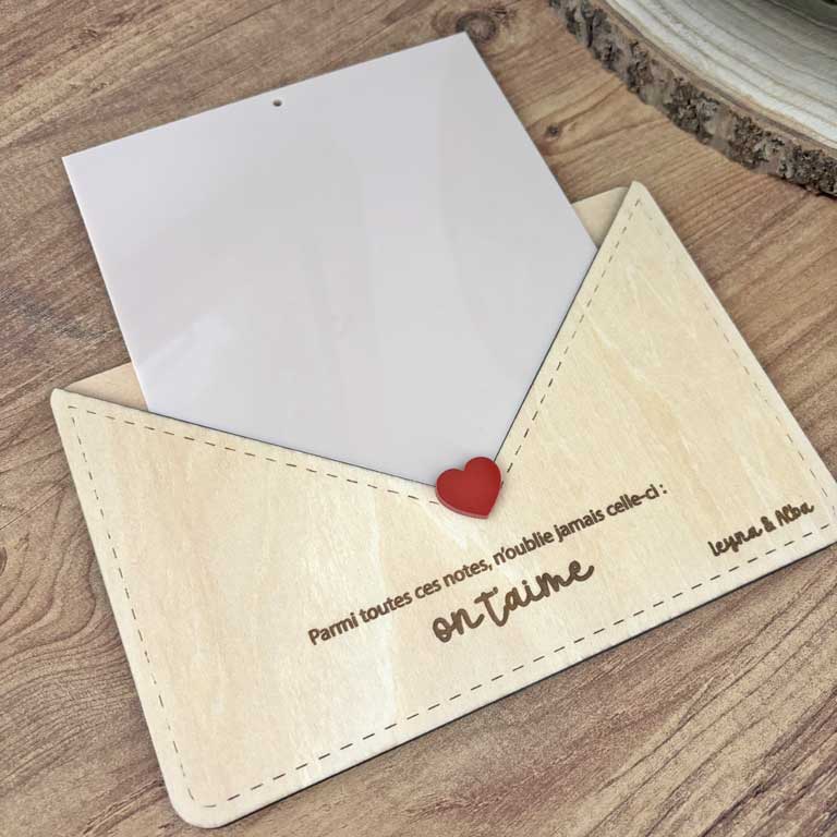 Son design original en forme d’enveloppe, agrémenté d’un petit cœur et d’un message personnalisable, apporte une touche chaleureuse à votre intérieur.