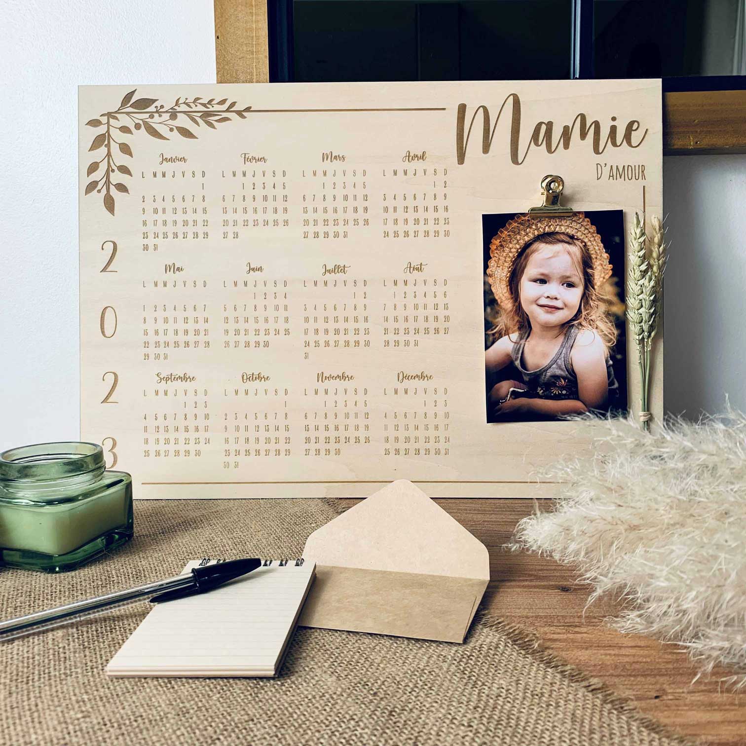 Ce calendrier en bois personnalisable est une décoration unique pour votre intérieur. Grâce à sa pince vous pourrez afficher la photo de votre choix qui pourra être changé facilement au fil de l’année ou encore vos rendez-vous ou évènements à ne pas manquer.